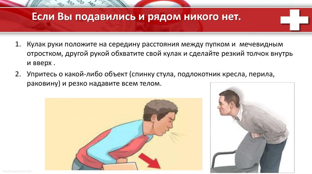Если Вы подавились и рядом никого нет.1. Кулак руки положите на середину расстояния между пупком и мечевидным