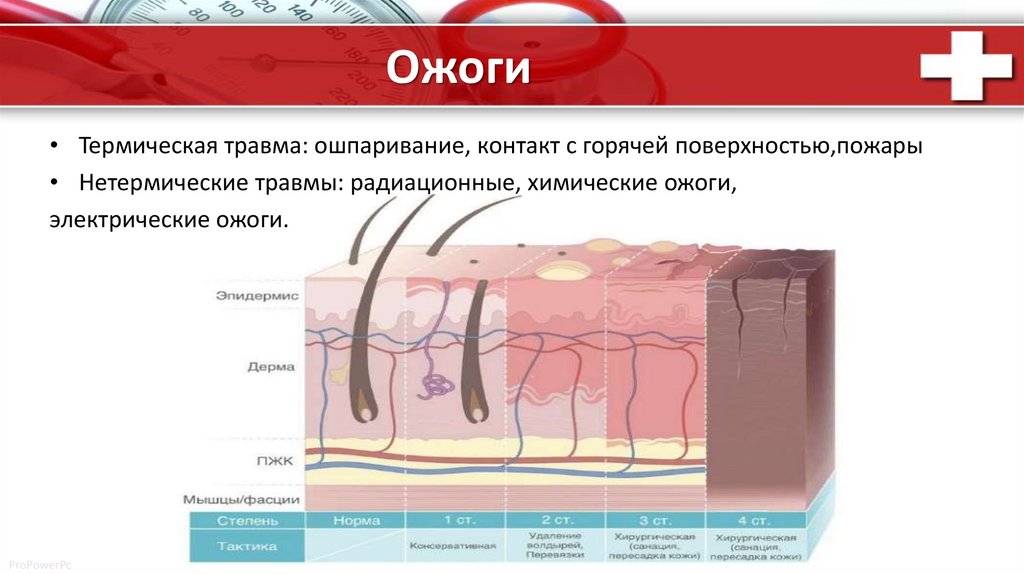 Ожоги• Термическая травма: ошпаривание, контакт с горячей поверхностью,пожары