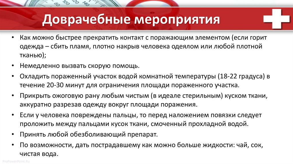 Доврачебные мероприятия• Как можно быстрее прекратить контакт с поражающим элементом (если горит