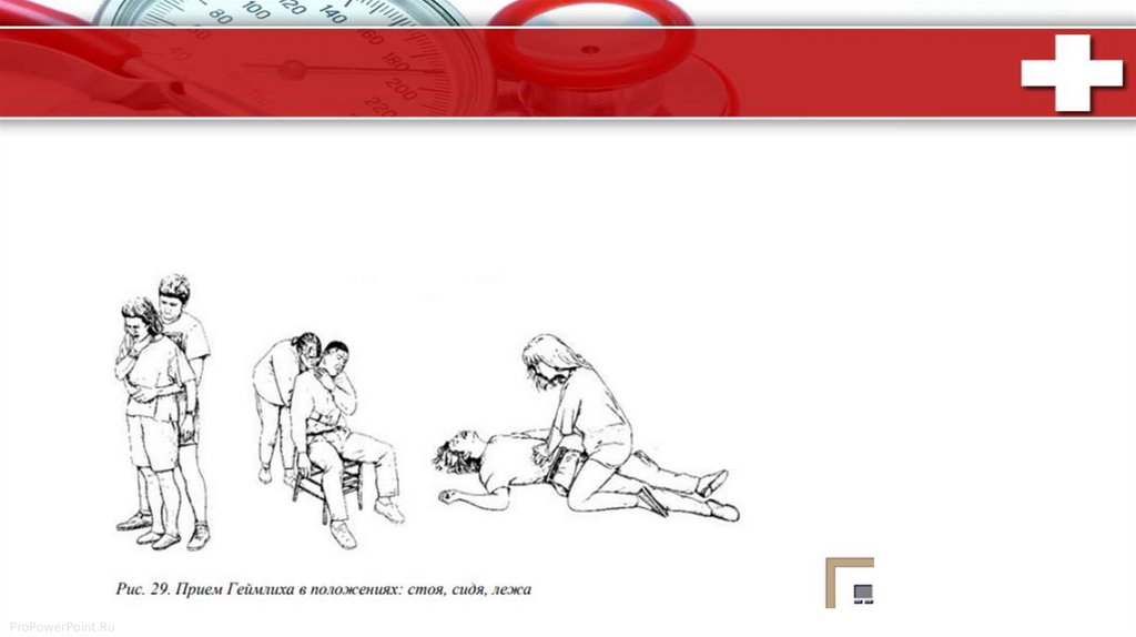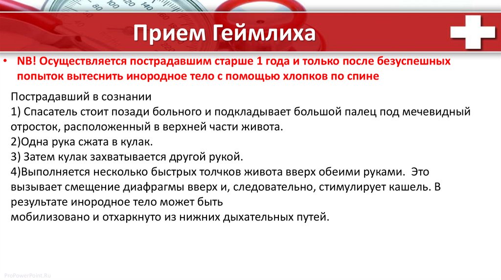 Прием Геймлиха• NB! Осуществляется пострадавшим старше 1 года и только после безуспешных