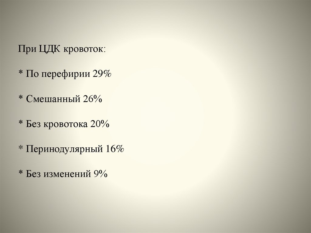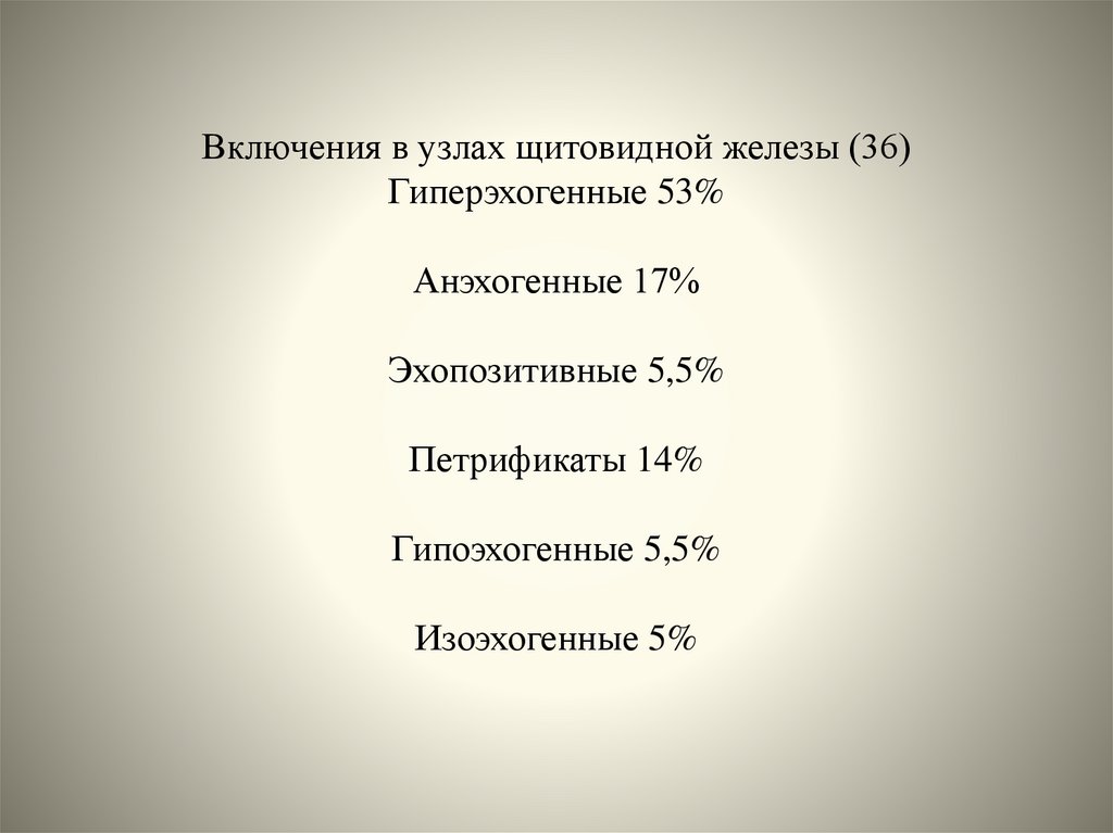 Включения в узлах щитовидной железы (36)Гиперэхогенные 53%