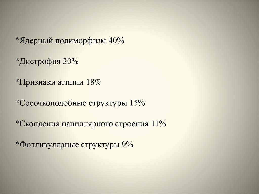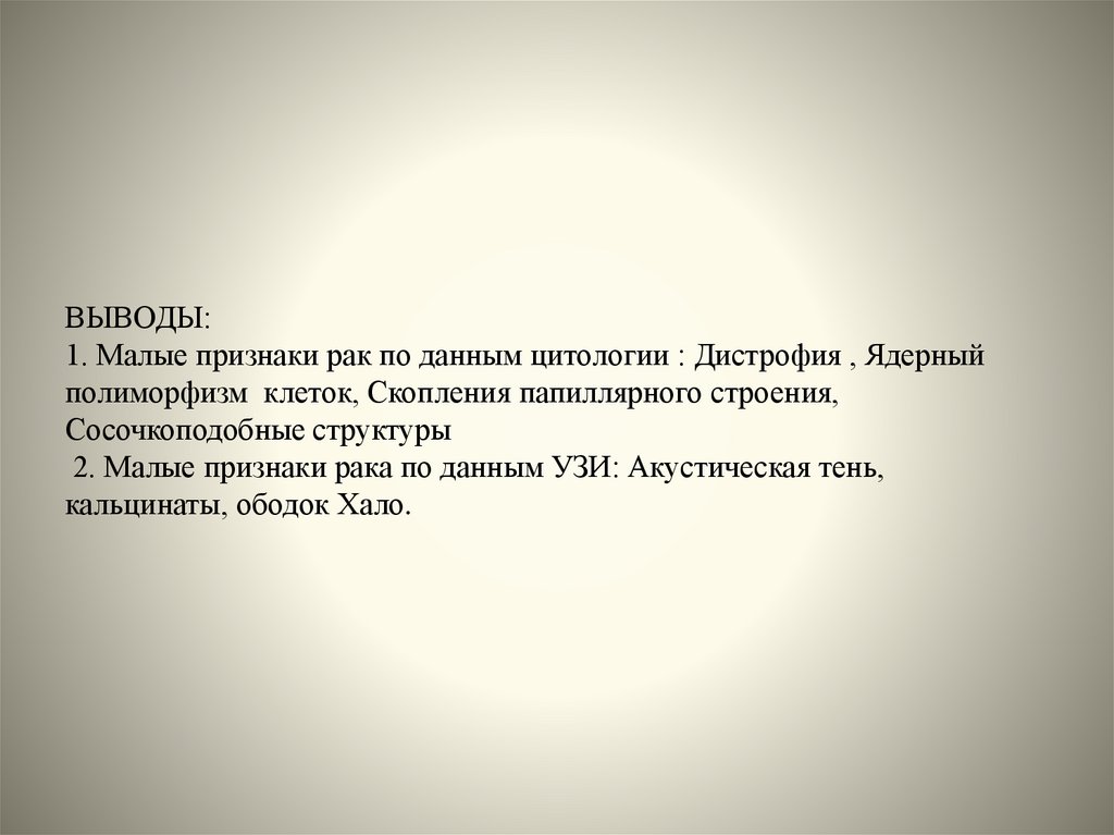 ВЫВОДЫ:1. Малые признаки рак по данным цитологии : Дистрофия , Ядерный