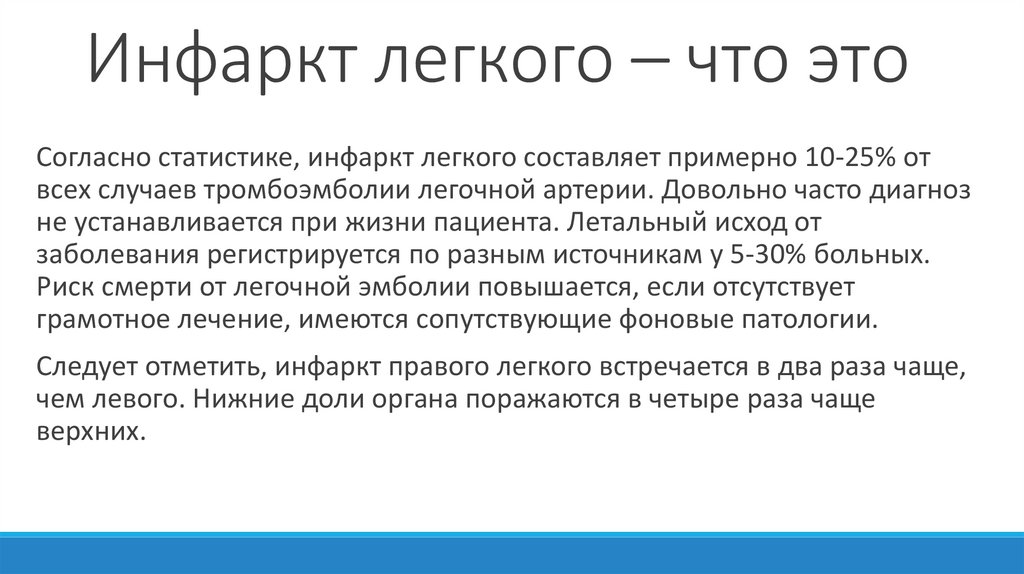 Инфаркт легкого – что этоСогласно статистике, инфаркт легкого составляет примерно 10-25% от