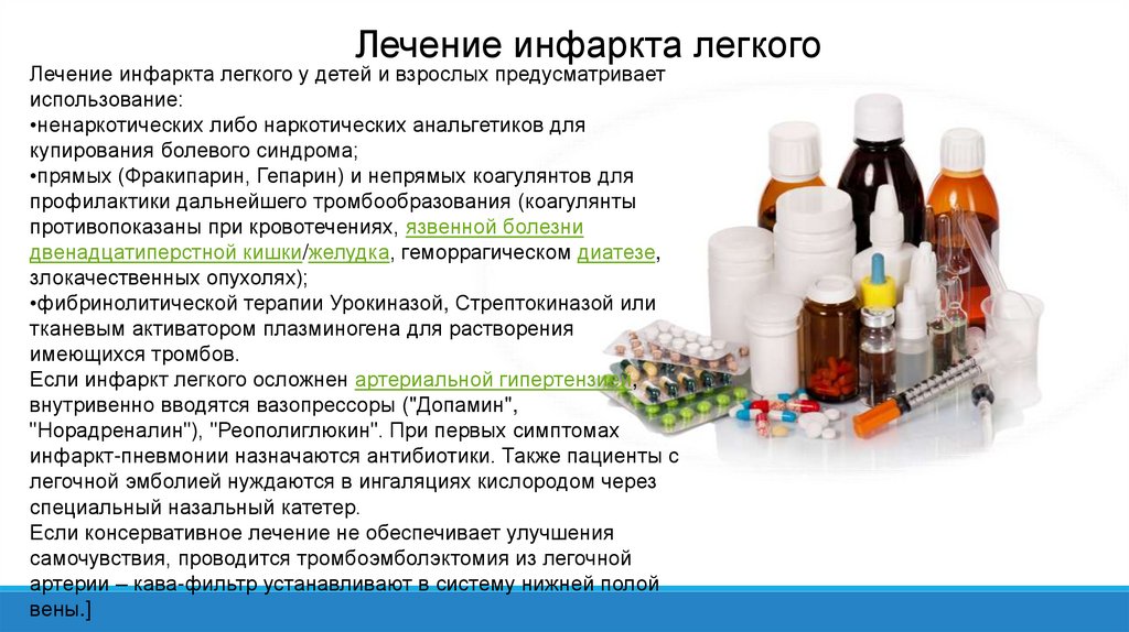Лечение инфаркта легкогоЛечение инфаркта легкого у детей и взрослых предусматривает