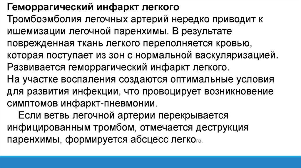 Геморрагический инфаркт легкогоТромбоэмболия легочных артерий нередко приводит к