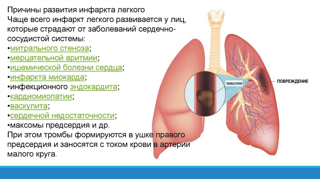 Причины развития инфаркта легкогоЧаще всего инфаркт легкого развивается у лиц,