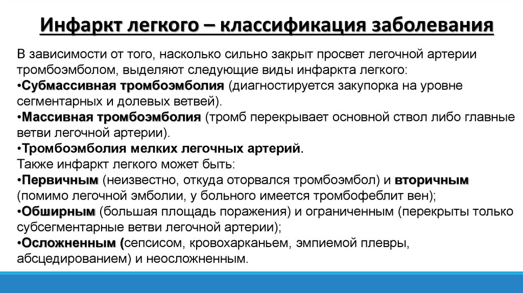 тромбоэмболом, выделяют следующие виды инфаркта легкого: