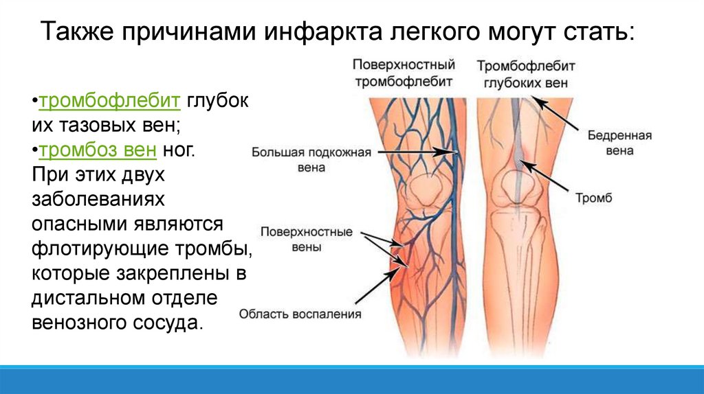 Также причинами инфаркта легкого могут стать:•тромбофлебит глубок