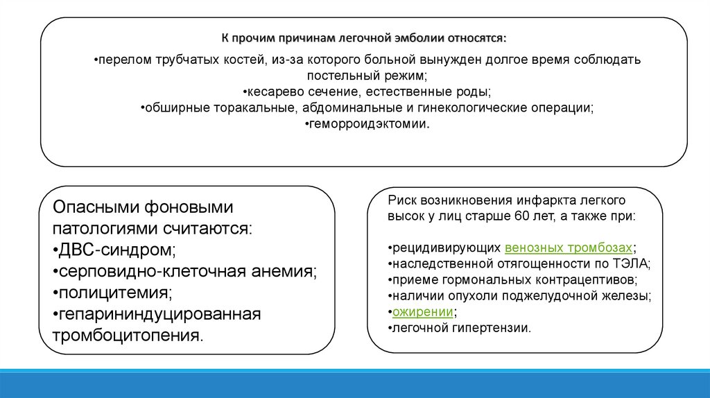 К прочим причинам легочной эмболии относятся:•перелом трубчатых костей, из-за которого больной вынужден долгое время соблюдать