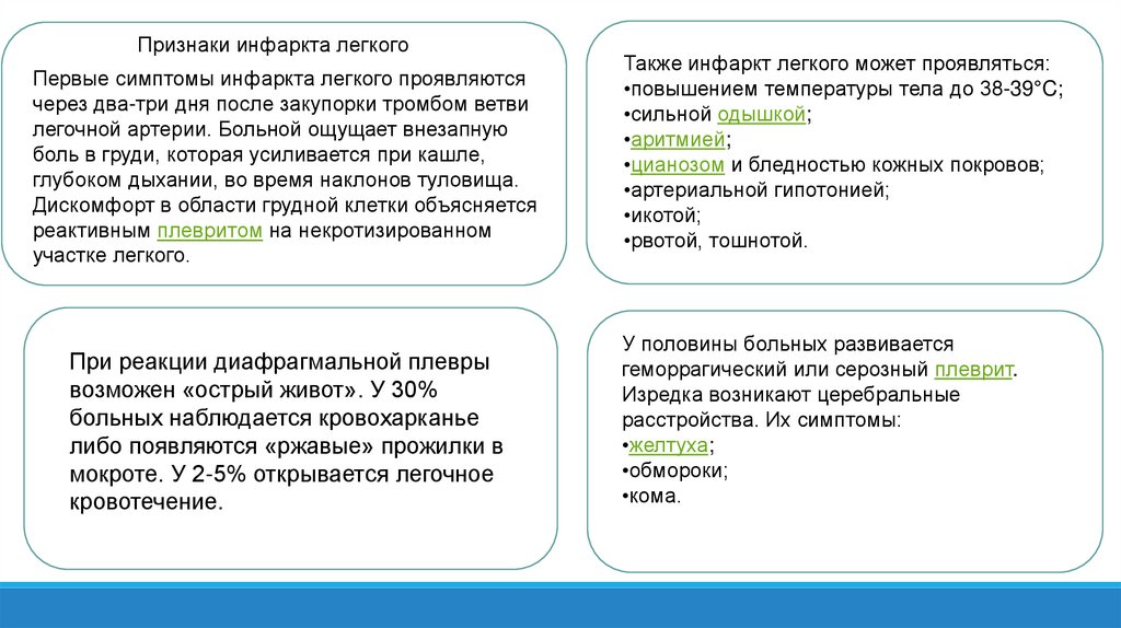 Признаки инфаркта легкогоПервые симптомы инфаркта легкого проявляются