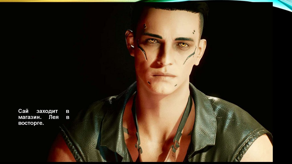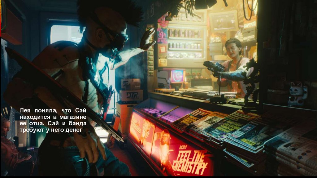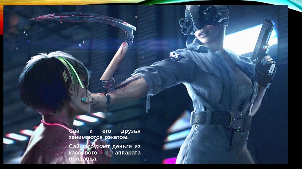 Сай и его друзья подходят к прилавку.Продавец-киборг