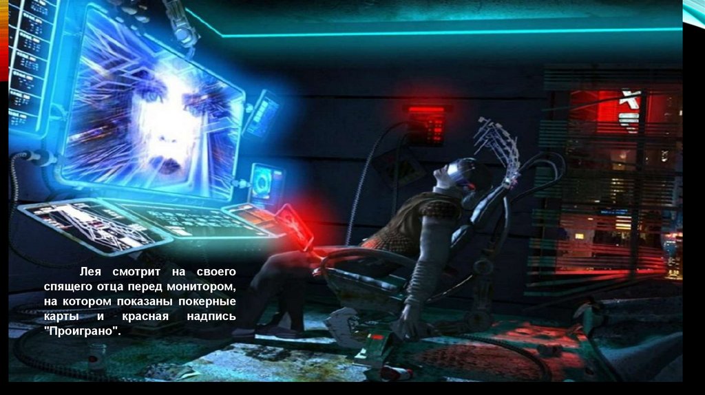 Лея смотрит на своегоспящего отца перед монитором,