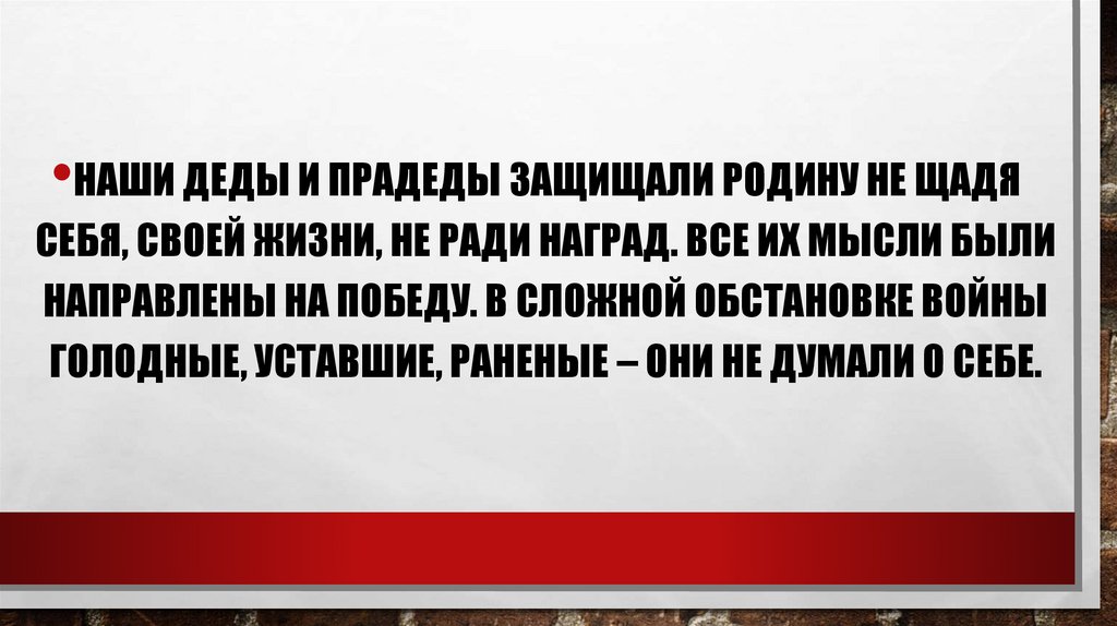 •НАШИ ДЕДЫ И ПРАДЕДЫ ЗАЩИЩАЛИ РОДИНУ НЕ ЩАДЯСЕБЯ, СВОЕЙ ЖИЗНИ, НЕ РАДИ НАГРАД. ВСЕ ИХ МЫСЛИ БЫЛИ