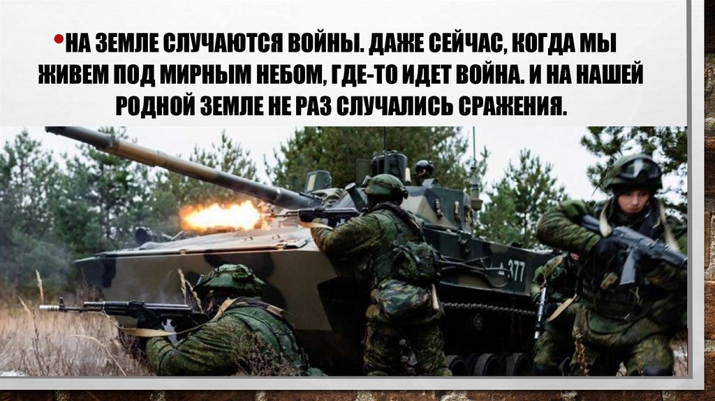 •НА ЗЕМЛЕ СЛУЧАЮТСЯ ВОЙНЫ. ДАЖЕ СЕЙЧАС, КОГДА МЫЖИВЕМ ПОД МИРНЫМ НЕБОМ, ГДЕ-ТО ИДЕТ ВОЙНА. И НА НАШЕЙ