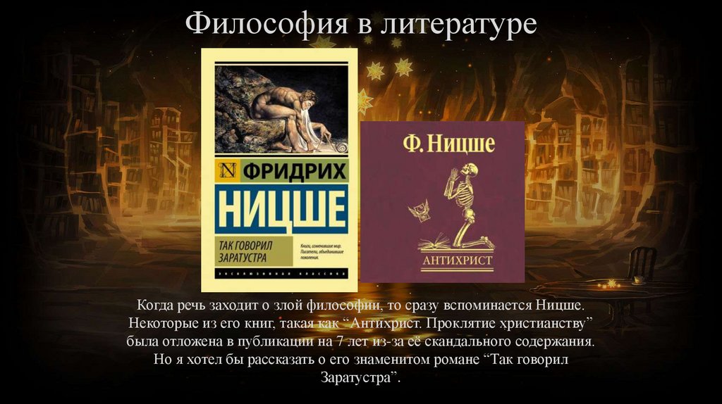 Философия в литературеКогда речь заходит о злой философии, то сразу вспоминается Ницше.