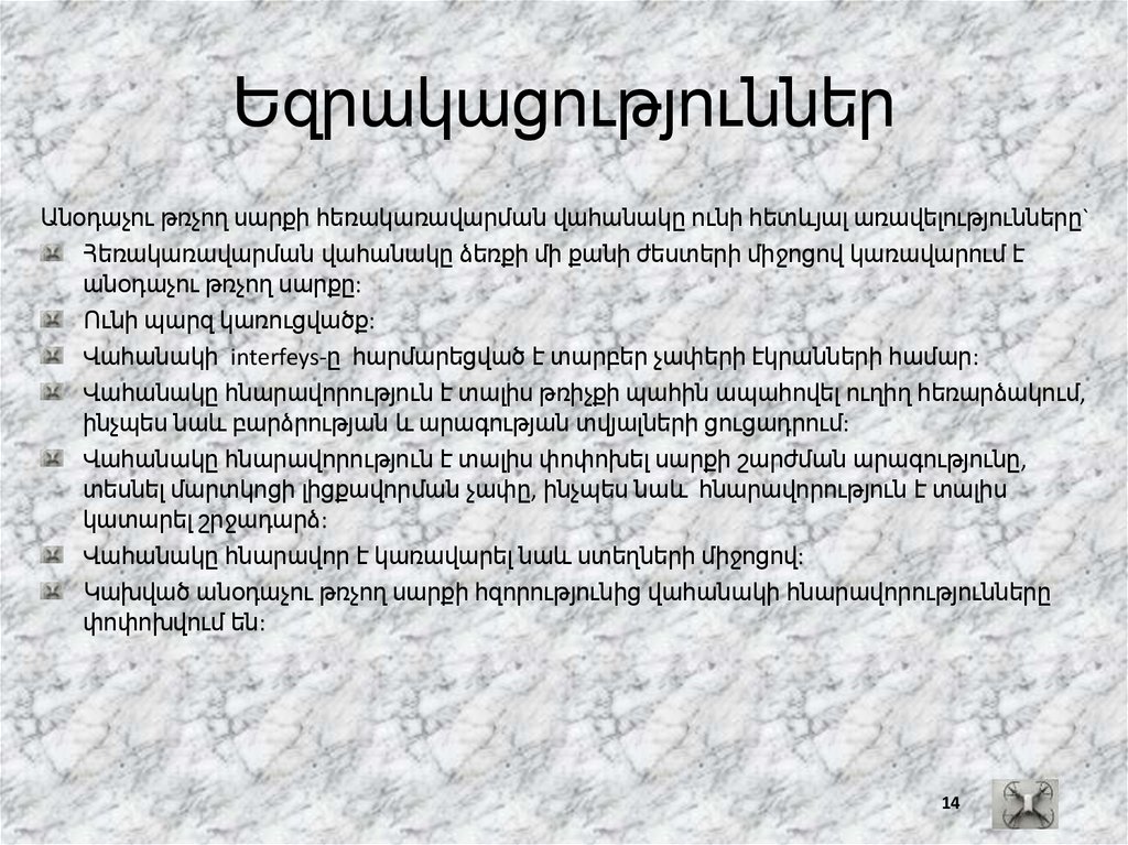 ԵզրակացություններԱնօդաչու թռչող սարքի հեռակառավարման վահանակը ունի հետևյալ առավելությունները`