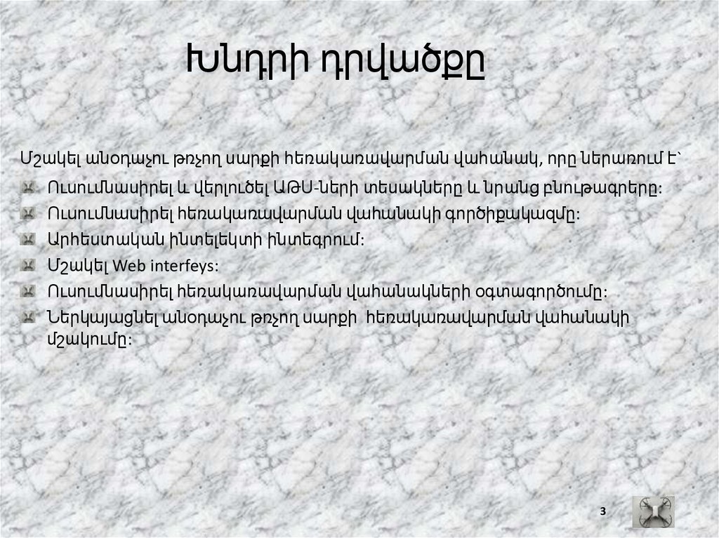 Խնդրի դրվածքըՄշակել անօդաչու թռչող սարքի հեռակառավարման վահանակ, որը ներառում է`