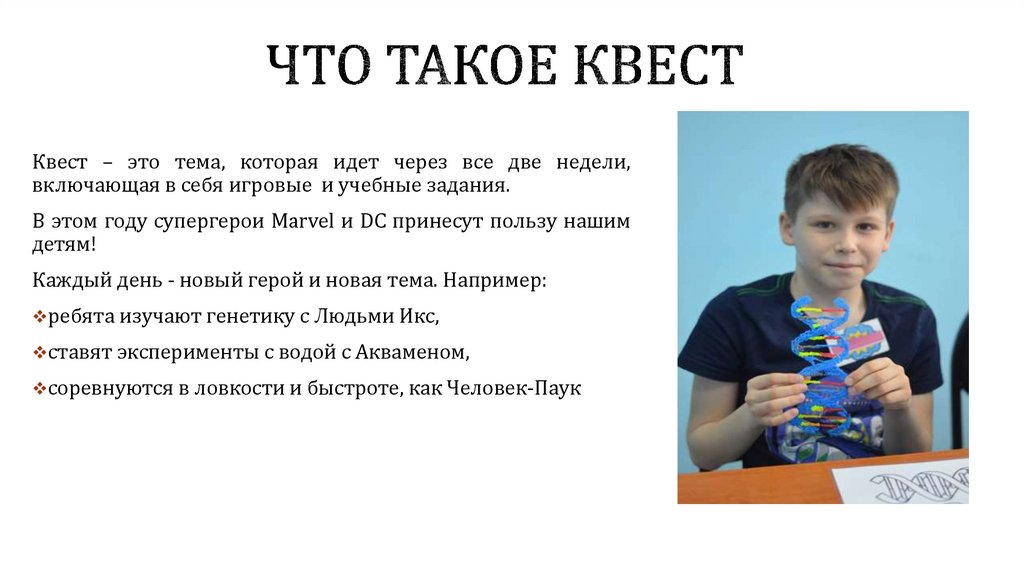 Квест – это тема, которая идет через все две недели,включающая в себя игровые и учебные задания.
