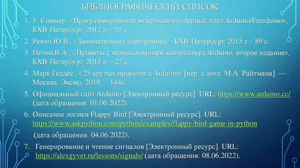 БИБЛИОГРАФИЧЕСКИЙ СПИСОК1. У. Соммер, «Программирование микроконтроллерных плат Arduino/Freeduino»,