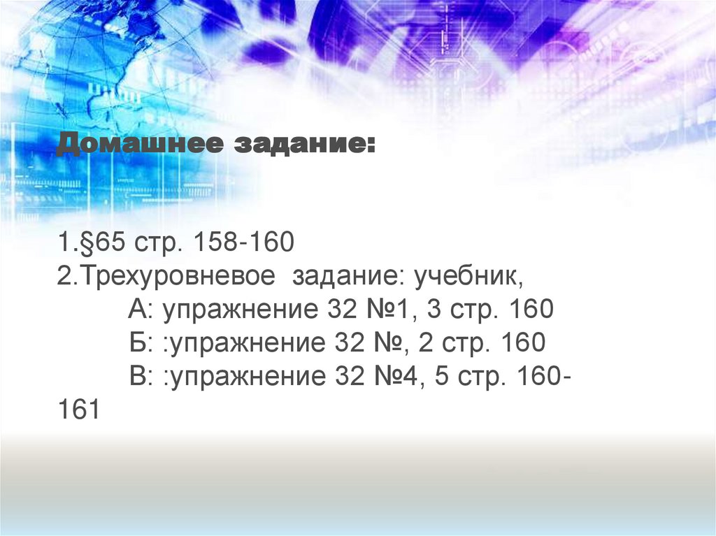Домашнее задание:1.§65 стр. 158-160