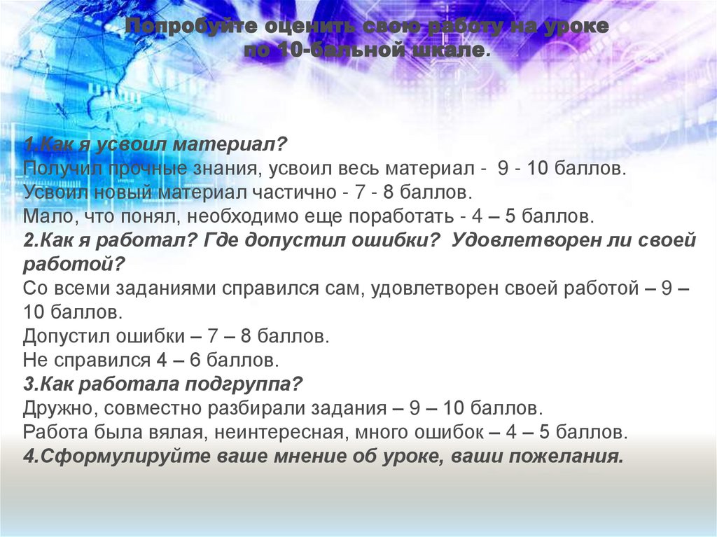 Попробуйте оценить свою работу на урокепо 10-бальной шкале.