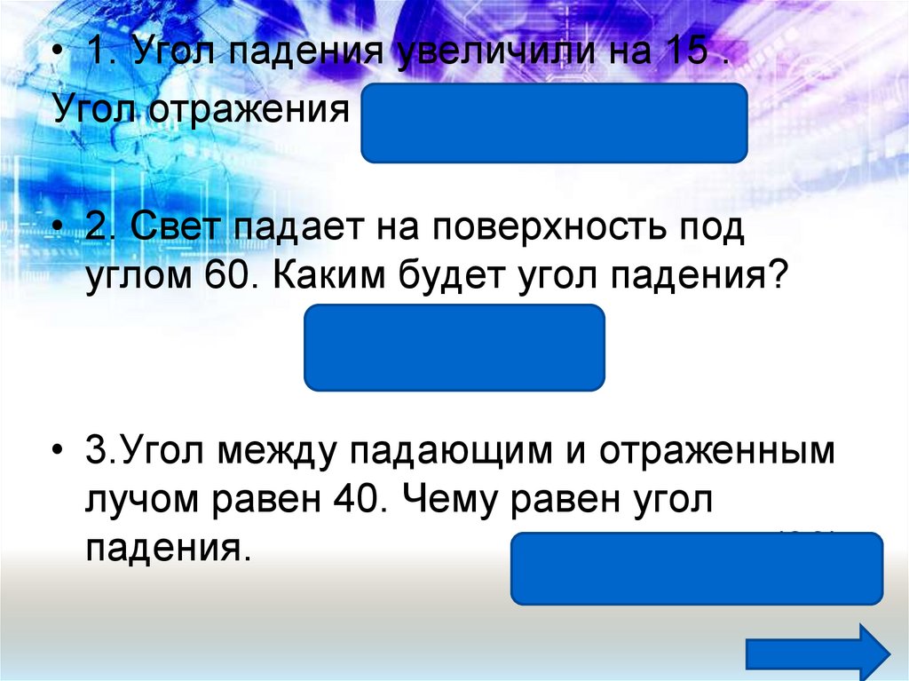 • 1. Угол падения увеличили на 15 .Угол отражения (увеличился на 15)
