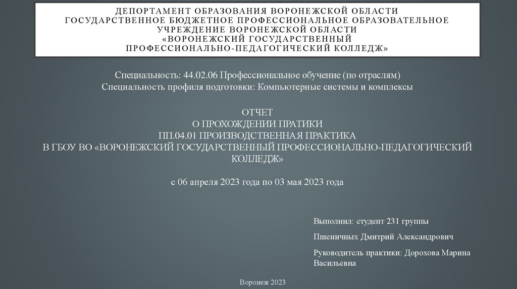 Д Е П О Р ТА М Е Н Т О Б РА З О ВА Н И Я В О Р О Н Е Ж С КО Й О Б Л АС Т ИГ О С УД А Р С Т В Е Н Н О Е Б ЮД Ж Е Т Н О Е П Р О Ф Е С С И О Н А Л Ь Н О Е О Б РА З О ВАТ Е Л Ь Н О Е