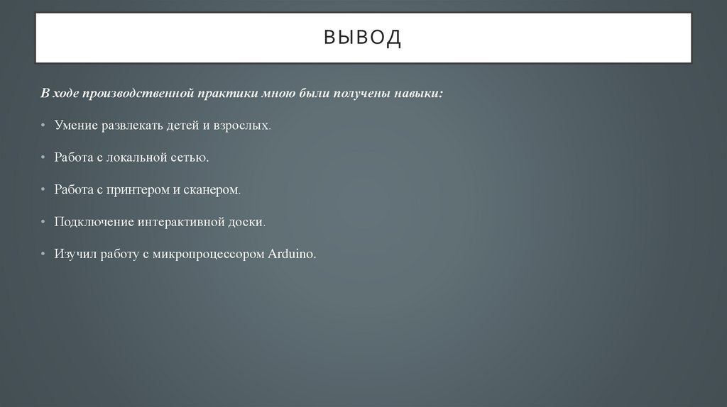 ВЫВОДВ ходе производственной практики мною были получены навыки: