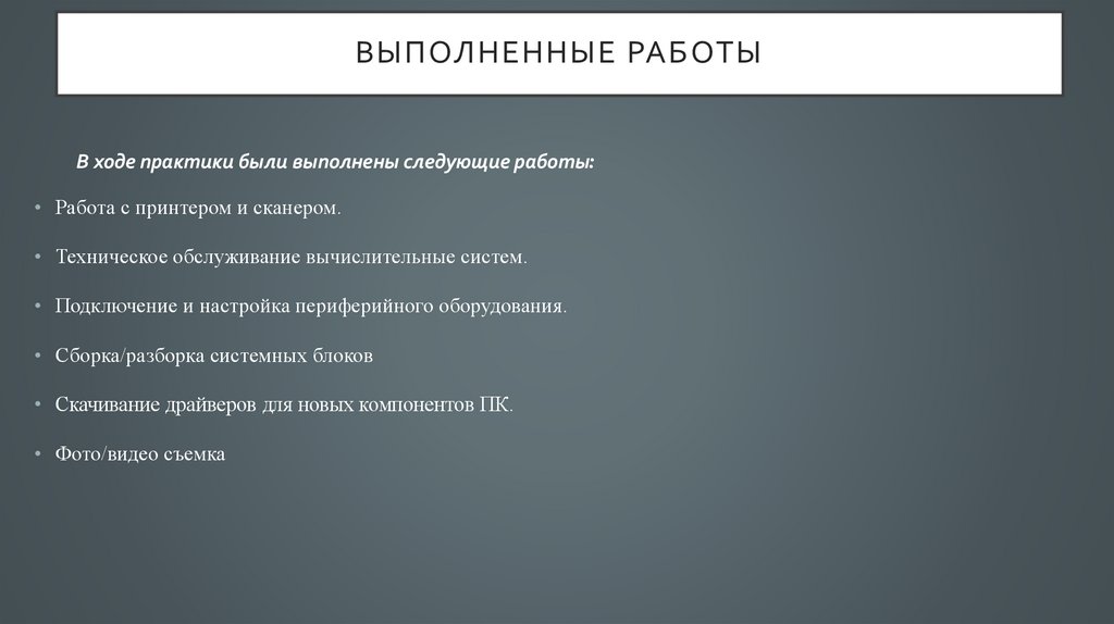 ВЫПОЛНЕННЫЕ РАБОТЫВ ходе практики были выполнены следующие работы: