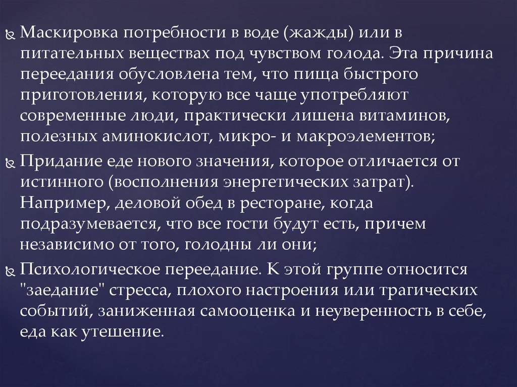 Маскировка потребности в воде (жажды) или впитательных веществах под чувством голода. Эта причина