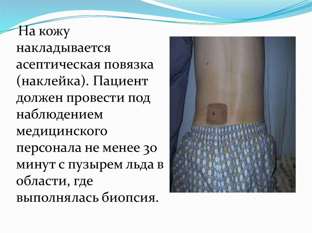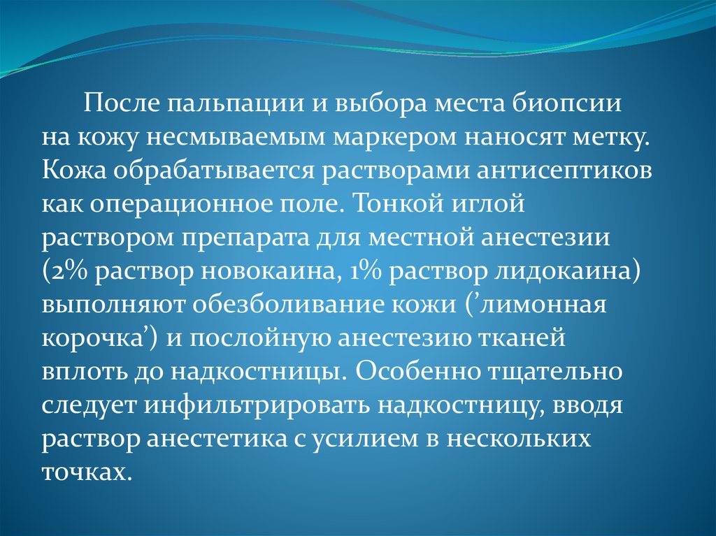 После пальпации и выбора места биопсиина кожу несмываемым маркером наносят метку.