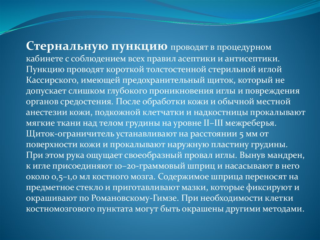 Стернальную пункцию проводят в процедурномкабинете с соблюдением всех правил асептики и антисептики.