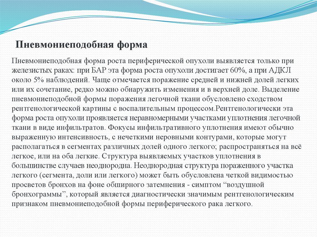 Пневмониеподобная формаПневмониеподобная форма роста периферической опухоли выявляется только при