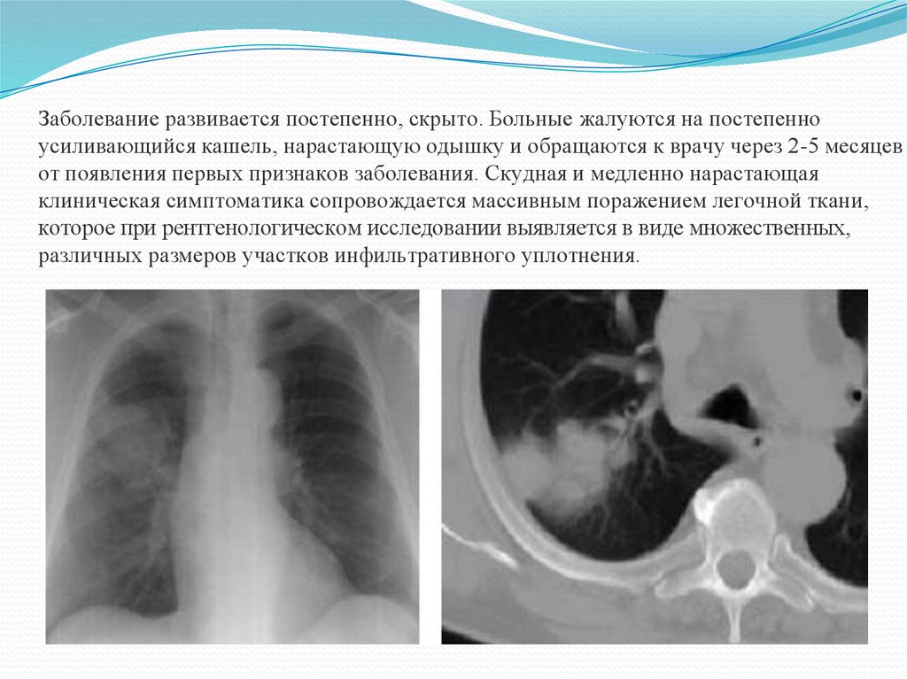 Заболевание развивается постепенно, скрыто. Больные жалуются на постепенноусиливающийся кашель, нарастающую одышку и обращаются к врачу через 2-5 месяцев