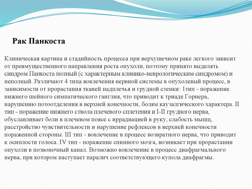 Рак ПанкостаКлиническая картина и стадийность процесса при верхушечном раке легкого зависит