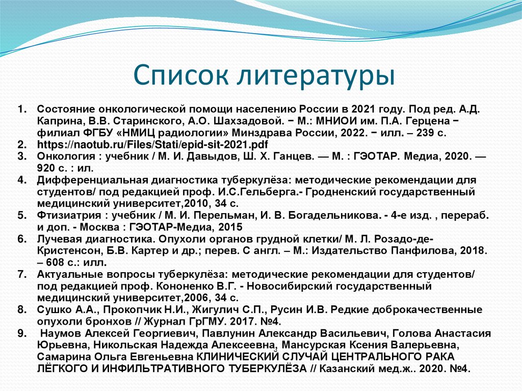 Список литературы1. Состояние онкологической помощи населению России в 2021 году. Под ред. А.Д.