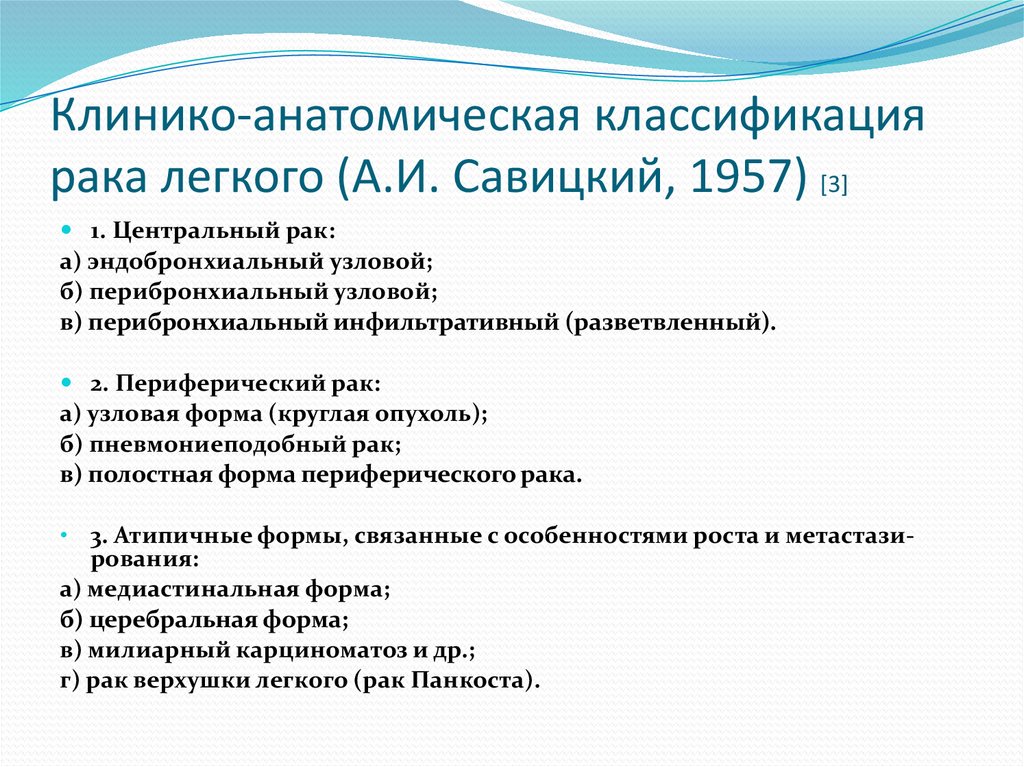 Клинико-анатомическая классификациярака легкого (А.И. Савицкий, 1957) [3]