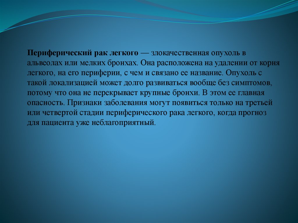 Периферический рак легкого — злокачественная опухоль вальвеолах или мелких бронхах. Она расположена на удалении от корня