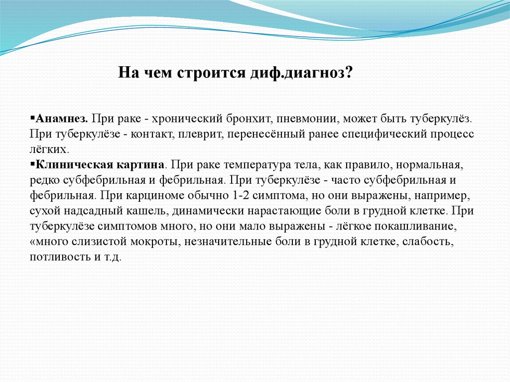 На чем строится диф.диагноз?Анамнез. При раке - хронический бронхит, пневмонии, может быть туберкулёз.
