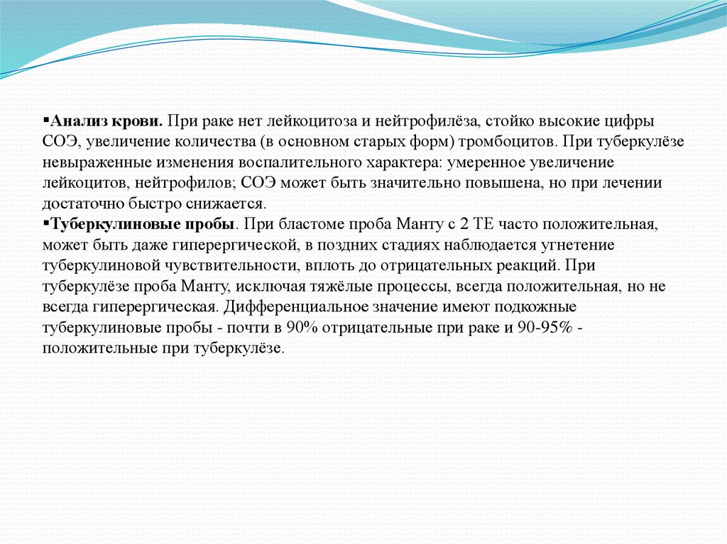 Анализ крови. При раке нет лейкоцитоза и нейтрофилёза, стойко высокие цифрыСОЭ, увеличение количества (в основном старых форм) тромбоцитов. При туберкулёзе