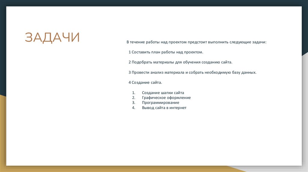 ЗАДАЧИВ течение работы над проектом предстоит выполнить следующие задачи: