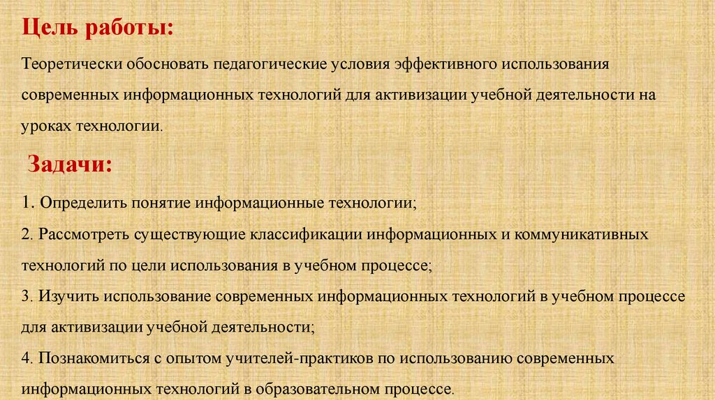 Цель работы:Теоретически обосновать педагогические условия эффективного использования