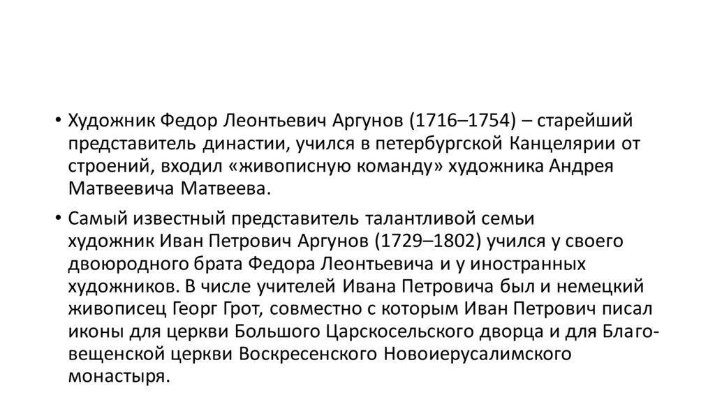 • Художник Федор Леонтьевич Аргунов (1716–1754) – старейшийпредставитель династии, учился в петербургской Канцелярии от