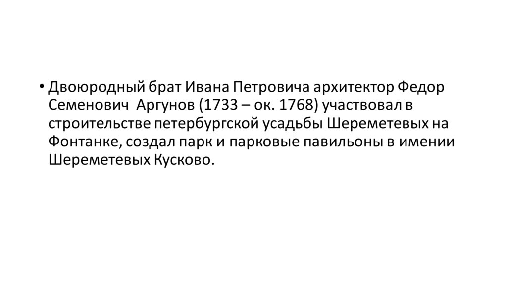 • Двоюродный брат Ивана Петровича архитектор ФедорСеменович Аргунов (1733 – ок. 1768) участвовал в