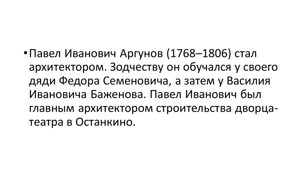 • Павел Иванович Аргунов (1768–1806) сталархитектором. Зодчеству он обучался у своего