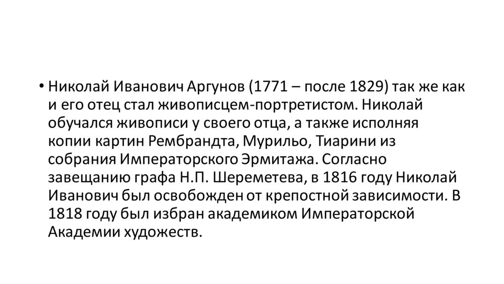 • Николай Иванович Аргунов (1771 – после 1829) так же каки его отец стал живописцем-портретистом. Николай