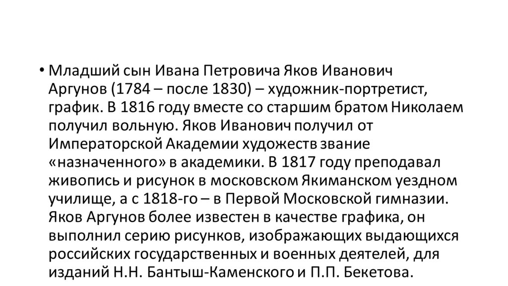 • Младший сын Ивана Петровича Яков ИвановичАргунов (1784 – после 1830) – художник-портретист,