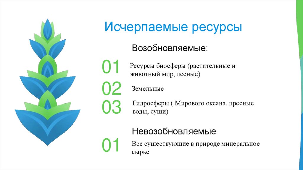 Исчерпаемые ресурсыВозобновляемые: