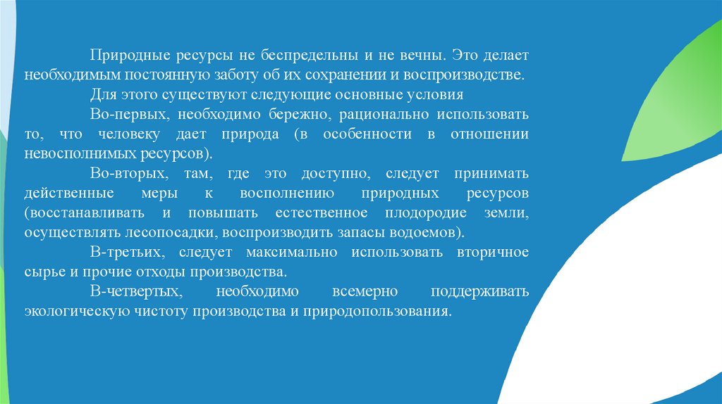 Природные ресурсы не беспредельны и не вечны. Это делаетнеобходимым постоянную заботу об их сохранении и воспроизводстве.