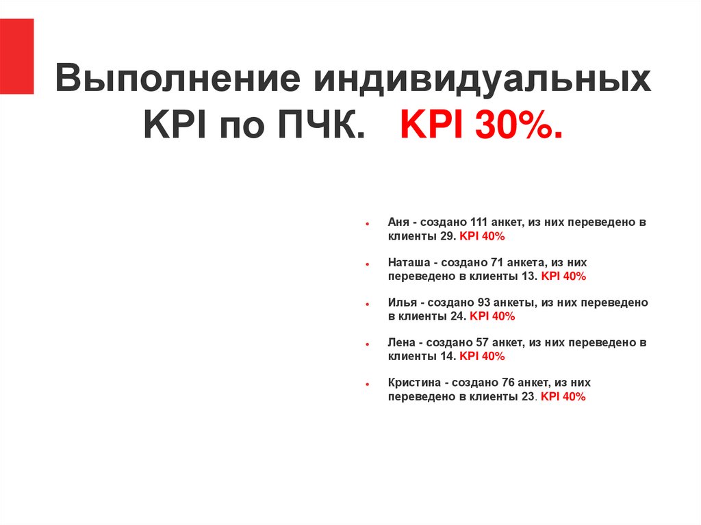 Выполнение индивидуальныхKPI по ЧК. KPI 40%.